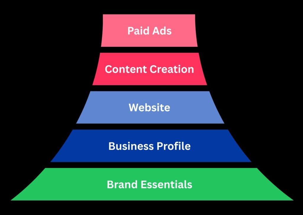 If you are new to marketing, this pyramid shows you where to start (at the bottom) to build a strong foundation for your marketing to run on.